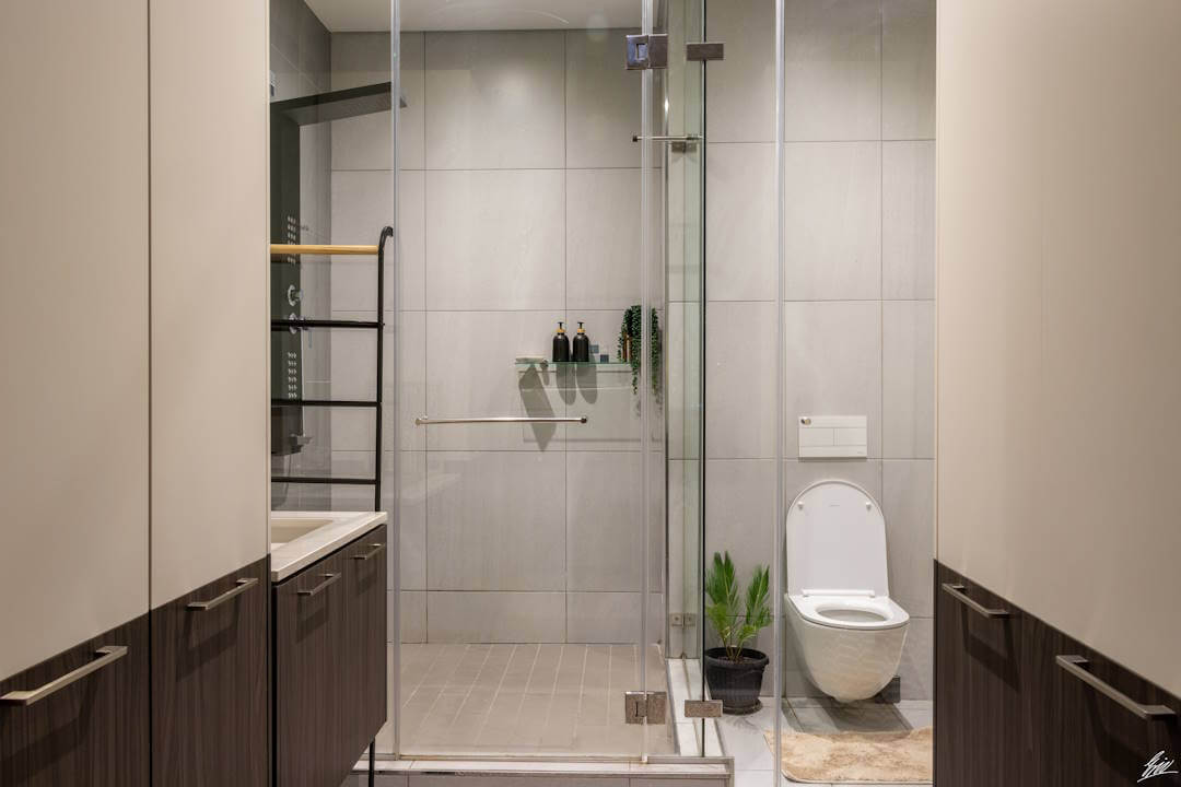 The apartment features one bedroom, one bathroom, and a living room. Amenities include air-conditioning, balcony, washing machine, patio, kitchen, hairdryer, city view, dining table, walk-in shower, refrigerator, work desk, seating area, microwave, shower, dressing room, TV, sofa, electric kettle, oven, stovetop, and toaster.